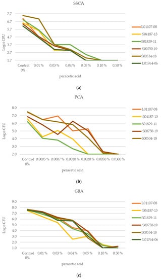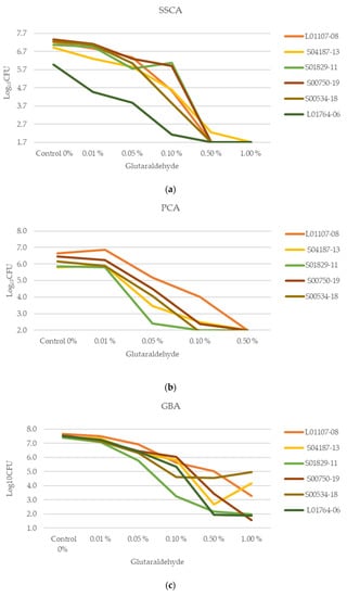 To detect a reduction ≥4 log10 CFU for a strain, the mean log10 CFU of the untreated strain had to be at least 4 log10 CFU above the limit of detection (LOD) of the assay used, resulting in a minimum of 5.7 log10, 5.0 log10, and 6.0 log10 CFU for SSCA, PCA, and GBA, respectively. Strain L01765-06, which also showed the weakest biofilm formation in the MTP assay, was, therefore, excluded for the PCA, as it did not reach consistently high cell numbers. Figure 2a–c show the effect of peracetic acid on each strain within each assay. Figure 3a–c show the effect of glutaraldehyde on each strain within each assay. The mean log10 CFU and the standard deviation (SD) for each strain in all three assays are included in the Supplementary Materials (Table S3).
