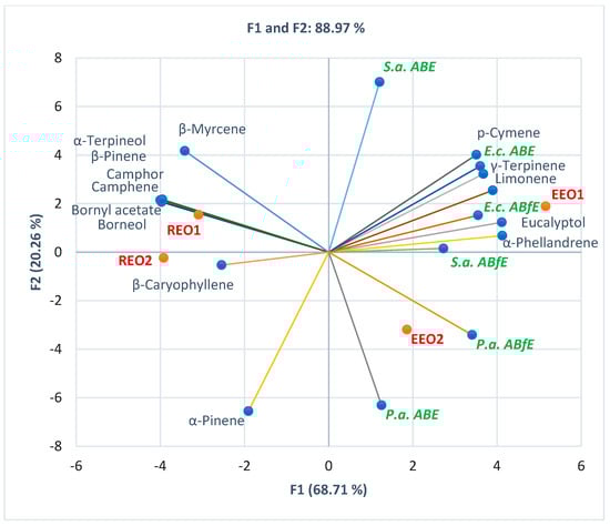 PCA-Biplot displays the correlations between bioactive constituents and antibacterial and antibiofilm effects on Gram-positive and Gram-negative bacteria in each EEO and REO sample. EEOs 1–2—Eucalyptus essential oils from two different manufacturers; REOs 1–2—Rosemary essential oils from two different manufacturers; S.a.—S. aureus, E.c.—E. coli, P.a.—P. aeruginosa, ABE—Antibacterial efficacy, ABfE—Antibiofilm efficacy.