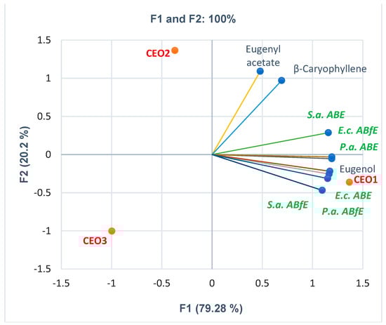 Eugenyl acetate and β-caryophyllene correlate moderately with S.a. ABE (r = 0.611, r = 0.760, p > 0.05). β-caryophyllene displays a low correlation (r = 0.543, r = 0.559, p > 0.05) with E.c. ABfE and P.a. ABE. Finally, the PCA-Biplot shows each CEO sample’s place considering these variable parameters; it provides evidence that CEO1 is substantially active regarding antibacterial and antibiofilm effects. All detailed data are found in Supplementary Material.
