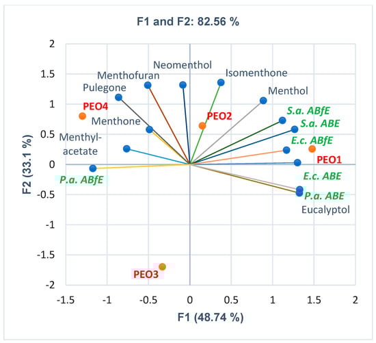 PCA-Biplot displaying the correlations between bioactive constituents’ content and antibacterial and antibiofilm effects on Gram-positive and Gram-negative bacteria in each PEO sample; PEO1–4—Peppermint essential oil from four different manufacturers; S.a.—S. aureus, E.c.—E. coli, P.a.—P. aeruginosa, ABE—Antibacterial efficacy, ABfE—Antibiofilm efficacy.