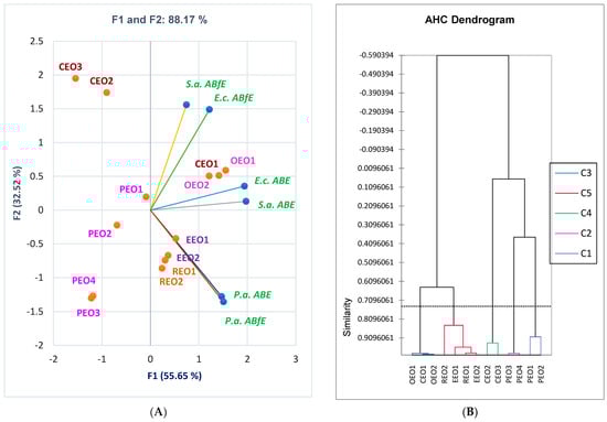 (A) PCA-Biplot displays the antibacterial and antibiofilm efficacy of essential oils and antibacterial drugs against Gram-positive and Gram-negative bacteria. (B) AHC-Dendrogram. C1–C5 —clusters: C1 (PEO1, PEO2), C2 (PEO3, PEO4), C3 (CEO1, OEO1, OEO3), C4 (CEO2, CEO3), C5 (REO1, REO2, EEO1, EEO2). GEN—Gentamicin; STR—Streptomycin; AMC—Amoxicillin-Clavulanic acid; OEOs 1–2—Oregano essential oils from two different manufacturers; EEOs 1–2—Eucalyptus essential oils from two different manufacturers; REOs 1–2—Rosemary essential oils from two different manufacturers; CEOs 1–3—Clove essential oils from three different manufacturers; PEOs 1–4—Peppermint essential oils from four different manufacturers; S.a.—S. aureus, E.c.—E. coli, P.a.—P. aeruginosa, ABE—Antibacterial efficacy, ABfE—Antibiofilm efficacy.