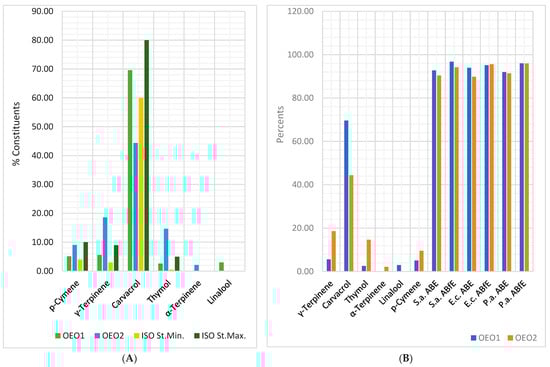 (A) Chemical composition of OEO samples provided by the manufacturers, compared to ISO 13171:2016 standard. (B) Bioactive constituents and antibacterial and antibiofilm effects of OEOs. The correlation between chemical constituents and antibacterial and antibiofilm activities of Oregano oil samples. S.a.—S. aureus, E.c.—E. coli, P.a.—P. aeruginosa, ABE—Antibacterial efficacy, ABfE—Antibiofilm efficacy, ISO St.Min./Max.—the constituents’ content limits from ISO 13171:2016 standard.