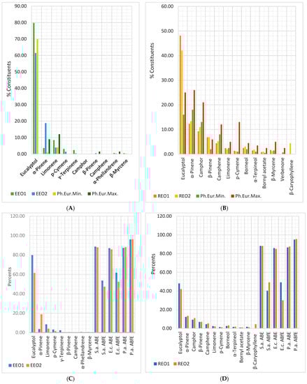 Figure 6A shows that the eucalyptol content in EEO2 is lower than EEO1 and Ph. Eur.Min., while the α-pinene content is higher. Both EEOs have three compounds unmentioned in Ph. Eur. 10 (p-cymene, γ-terpinene, and α-phellandrene). Figure 6B reveals that both REOs have eucalyptol content substantially higher than Ph. Eur.Max. (48.10 and 42.05 > 25%); β-pinene ones are slightly increased than Ph. Eur. 10 maximal value (6.84 and 6.89 > 6.00%). α-Pinene (12.29 and 13.35%), camphor (9.23 and 10.26%), and camphene (4.42 and 5.28%) are significantly lower than Ph. Eur.Min. (18, 13, and 8%). EEOs and REOs display considerable antibacterial effects on all bacteria tested (Figure 6C,D). The antibiofilm activities are substantial on P. aeruginosa and moderate on S. aureus and E. coli. Eucalyptol is the primary metabolite responsible for it in both EOs; its content in REOs was higher than maximal limits from Ph. Eur. 10. Its activity is potentiated by other compounds (limonene, p-cymene, and γ-terpinene) in both EOs and α-phellandrene in EEOs.