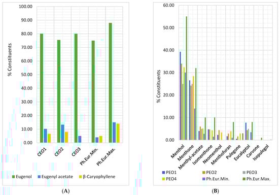Figure 7A shows that all three CEO samples contain eugenol and eugenyl acetate in the Ph. Eur. 10 range (75–88%, respectively, 4–13%). CEO1 and CEO3 have the highest eugenol content (80.00–80.06%). The eugenyl acetate content decreases in order: CEO2, CEO1, and CEO3 (13.27 > 10.25 > 5%). CEO3 did not have β-aryophyllene. Some aspects concerning PEOs’ chemical composition were observed, analyzing Figure 7B. Thus, all PEOs contain menthone and menthyl acetate in the Ph. Eur 10 limits (14–32% and, respectively, 2.80–10%). PEO1 has the highest contents of menthol, isomenthone, and eucalyptol (39.27, 4.75, and 7.70%), while PEO4 shows the greatest ones for menthone (28.45%), menthofuran (3.89%), and pulegone (2.90%), and PEO2 for menthyl acetate (6.01%) and neomenthol (4.42%). PEO3 contains only four bioactive compounds: menthol (<30%), menthone, menthyl acetate, and eucalyptol; PEO4 has no eucalyptol. Moreover, two constituents mentioned in Ph. Eur. 10 (carvone and isopulegol) were not found in PEOs samples. At the same time, neomenthol, contained by PEO1, PEO2, and PEO4, did not appear in Menthae piperitae aetheroleum monograph from Ph. Eur. 10.; the same observation is available for menthofuran (3.89%) and pulegone (2.90%) and PEO2 for menthyl acetate (6.01%) and neomenthol (4.42%). PEO3 contains only four bioactive compounds: menthol (< 30%), menthone, menthyl acetate, and eucalyptol; PEO4 has no eucalyptol. Moreover, two constituents mentioned in Ph. Eur. 10 (carvone and isopulegol) were not found in PEOs samples. At the same time, neomenthol, contained by PEO1, PEO2, and PEO4, did not appear in Menthae piperitae aetheroleum monograph from Ph. Eur. 10.