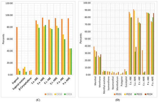 Figure 4 and Figure 7D show that PEO1 and PEO2 and, respectively, PEO3 and PEO4, act similarly. The primary metabolites implied in antibacterial and antibiofilm effects are menthol, menthone, menthyl acetate, and eucalyptol. They synergistically act with the others in lower content.