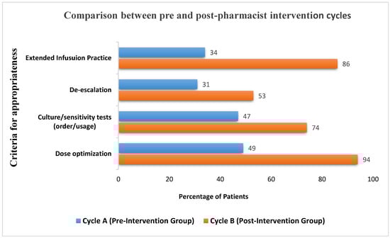 The final part of the study (CycB) was conducted on 100 patients from January 2023 until March 2023. A team of clinical pharmacists monitored all patients started on piperacillin/tazobactam using a report created in EHR. Based on DUE criteria for empirical use, as well as culture and sensitivity results, a de-escalation from piperacillin/tazobactam to another antimicrobial was carried out in a timely manner. Also, in some instances, piperacillin/tazobactam was discontinued after consulting with the prescribing physician. The overall appropriate use was measured.
