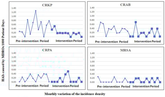 Monthly incidence density of HAIs caused by CRKP, CRAB, CRPA, and MRSA. Abbreviations: HAIs, healthcare-associated infections; CRKP, carbapenem-resistant Klebsiella pneumoniae; CRAB, carbapenem-resistant Acinetobacter baumannii; CRPA, carbapenem-resistant Pseudomonas aeruginosa; MRSA, methicillin-resistant Staphylococcus aureus.