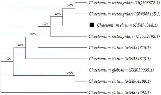 Only isolate VII was molecularly identified among the obtained isolates since the antimicrobial activity of its extract showed the highest antimicrobial activity. At the same time, no proliferation of cancer cells or toxic effects on normal cells were shown. Therefore, we choose this isolate for further research such as molecular identification, isolation of the secondary metabolites, and their antimicrobial activities. Molecular identification of isolate VII was performed by sequencing ITS 4 and 5 regions of the fungus genome and the obtained DNA sequences (578 bp) were submitted to the GenBank with the accession number OP476344.1. Isolate VII was identified as a C. elatum according to a BLAST search in the NCBI database. In this study, C. elatum was isolated from H. officinalis for the first time. To date, endophytic fungi such as Alternaria alternata and Cercospora sp. were isolated from H. officinalis [27]. Additionally, C. elatum has been isolated from Salvia officinalis among the plants of the family of Lamiaceae [28]. The phylogenetic tree was constructed after the basic local alignment search tool (BLAST) search in the National Center for Biotechnology Information (NCBI) database using obtained ITS sequence together with the retrieved first nine sequences from the GenBank by MEGA 11 software (Figure 1) [29].