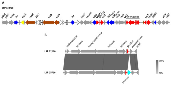 Genetic environment of chromosomal resistance genes found in S. Derby isolated from human clinical samples and food samples in Spain. (A). Genetic organization of the SGI1-variant, using LSP 138/08 as a model. (B). Comparison of the genetic context of fosA7.3 in LSP 82/16 (used as a model) and LSP 25/16. The alignments were created with Easyfig BLASTn. The gray shading between regions reflects nucleotide sequence identities according to the scale shown at the right lower corner of the figure. Genes are represented by arrows pointing to the direction of transcription. Genes with similar functions are shown in the same color. Color code: yellow, DNA replication; brown, conjugal transfer; blue, genes involved in DNA mobility; red, resistance genes; grey, other functions; white, hypothetical proteins.