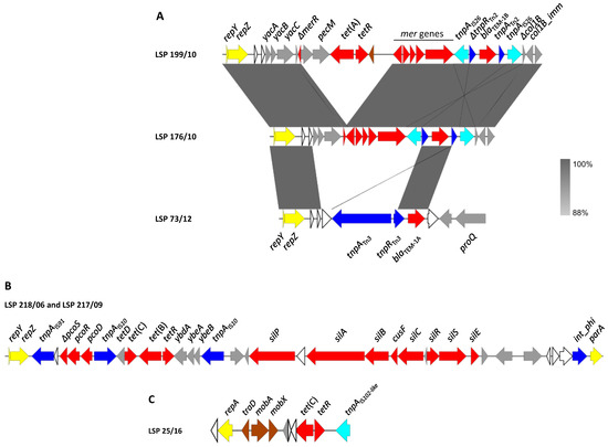 Genetic map of resistance genes carried by plasmids in S. Derby recovered from food and human clinical samples in Spain. Genes are represented by arrows pointing to the direction of transcription and color-coded according to function (see below). (A). Comparison of the resistance regions found in IncI1-I(α) plasmids of blaTEM-1-positive isolates. The alignments were created with Easyfig BLASTn. The gray shading between regions shows nucleotide sequence identities according to the scale shown at the right lower corner of the figure. (B). Resistance region of the tet(B)-positive IncI1-I(α) plasmids found in LSP 218/06 and LSP 217/09. (C). pSC101-like plasmid of LSP 25/16 used as a model. Color code: yellow, plasmid replication and maintenance; brown, conjugational transfer; blue, DNA mobility; red, resistance; grey, other functions; white, hypothetical proteins.