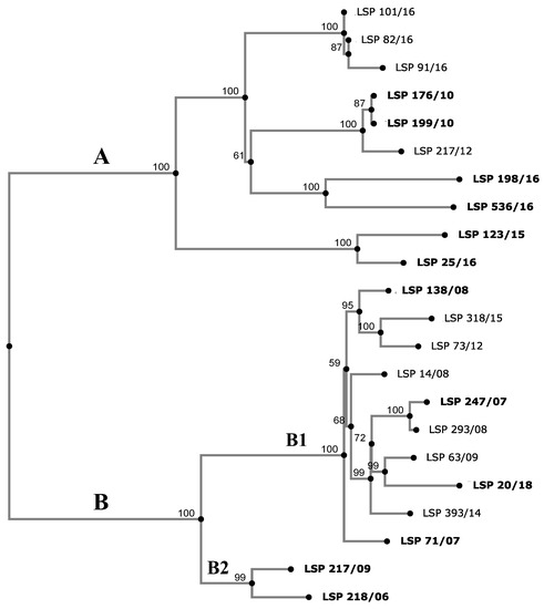 To establish the relationships existing between the isolates, a phylogenetic tree was constructed based on SNPs detected by CSI Phylogeny in the genomes sequenced. The number of SNPs ranged from 2 (LSP 82/16 vs. LSP 101/16 and LSP 176/10 vs. LSP 199/10) up to 293 (LSP 198/16 vs. LSP 20/18). The isolates were distributed into 2 clades (A and B), both comprising food-borne and human clinical isolates and supported by 100% bootstrap (Figure 3).