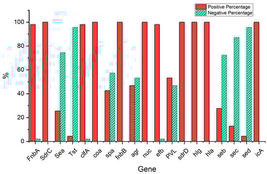 Polymerase chain reaction (Corbett Research PCR Thermal Cycler) was used for the determination of the 16s RNA region for the genus, as well as nineteen virulence genes, including, adhesion-associated genes (clfA, fnbA, fnbB, sdrC, sdrD, and spa), enterotoxin A, B, C, and D genes (sea, seb, sec, and sed), other exotoxin genes (hla, hlg, pvl, and tst), and other (coa, efb, icaA, nuc, and agr) genes, by using the list of specific primers shown in Table 1. The DNA of the S.aureus isolates was extracted using the DNeasy Blood & Tissue Kits (Qiagen, Germantown, MD, USA). Nineteen virulence genes were detected by multiple-PCR using the appropriate specific primers and electrophoresed amplicons on a 1–2% agarose gel with 0.5 μg/mL of ethidium bromide stain. The primer genes were selected based on earlier studies [16,17].