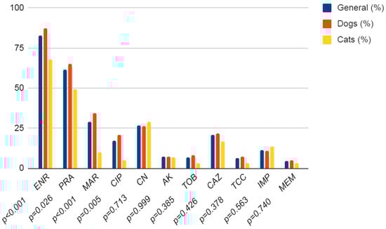 | Antibiotic | External Auricular Canal (n = 118) | Skin and Appendages (n = 31) | Respiratory System and Oral Cavity (n = 36) | Uro-Genital System (n = 10) | Wounds (n = 16) | p | |||||