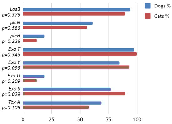 - Płókarz, D.; Czopowicz, M.; Bierowiec, K.; Rypuła, K. Virulence Genes as Markers for Pseudomonas aeruginosa Biofilm Formation in Dogs and Cats. Animals 2022, 12, 422. [Google Scholar] [CrossRef] [PubMed]
