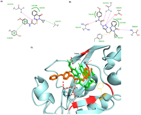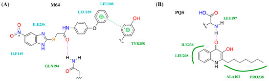 M64 is a known pqs inhibitor that has shown great therapeutic efficiency in the treatment of P. aeruginosa infections [12]. A cocrystal of M64 in complex with the PqsR ligand binding domain obtained from the Protein Data Bank (PDB) of Research Collaboratory for Structural Bioinformatics (RCSB) (PDB-6B8A) was used to observe key ligand–receptor interactions in DS [13]. A site-directed mutagenesis of amino acid residues in the PqsR binding pocket have concluded that hydrogen bonding with GLN194 and aromatic stacking interactions with TYR258 strongly contribute towards its affinity and pqs inhibition (Figure 2A) [13,14]. Molecular docking of M64 also suggests that the sp3 nature of the central sulfur atom allows for the correct geometry for the compound to fit into the hydrophobic binding pocket. Additionally, the docking of the natural ligand PQS into the LBD (Figure 2B) revealed that hydrogen bonding between LEU197 and the carbonyl moiety of the quinolone core could be a crucial interaction for its affinity with the receptor. Therefore, possible quinazolinone inhibitors were designed to incorporate these intermolecular interactions to achieve high affinity to the PqsR receptor.