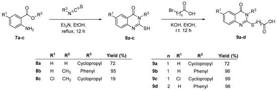 The synthesis of 2-mercaptoquinazolin-4(3H)-one analogues was essential for the preparation of possible pqs inhibitors containing a quinazolinone core. Anthranilic acid 7a, methyl anthranilate 7b and 5-chloro-substituted methyl anthranilate 7c were chosen as the precursors for this reaction series. Anthranilates 7a–c were reacted with an appropriate isothiocyanate and triethylamine in ethanol under reflux conditions to afford the 2-mercaptoquinazolin-4(3H)-one intermediates 8a–c in 19–95% yield (Scheme 1). Quinazolinone thiol 8c was obtained in low yields due to the electron-withdrawing nature of chlorine in 7c, which withdraws electrons from the amino group, decreasing its nucleophilicity. The quinazolinone thiols were converted to quinazolinone carboxylic acids using a modified version of the procedure described by Savino et al. (2018) [17]. In these reactions, the thiols 8a–8c were stirred with 2.0 equivalents of bromoacetic acid and potassium carbonate in ethanol at room temperature for 12 h to generate 9a–d in a 72–99% yield (Scheme 1).
