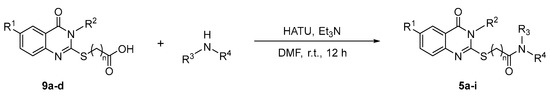 Amide functional groups have proven to be critical for pqs, biofilm and pyocyanin inhibition in a variety of known inhibitors [11,18]. These amide bonds are generally synthesised by coupling an amine with a carboxylic acid using stoichiometric amounts of a coupling reagent to ensure that the reaction occurs at ambient temperatures [19]. The synthesis of quinazolinone-based amides was attempted under different reaction conditions, and it was identified that the use of hexafluorophosphate azabenzotriazole tetramethyl uronium (HATU) as the coupling reagent provided the highest yield for the reaction (Scheme S1, Table S1). In such an attempt, 9a was dissolved in anhydrous dimethylformamide (DMF) in the presence of triethylamine and 4-methoxyaniline before HATU was added and the reaction mixture was stirred at room temperature overnight, following a modified procedure reported by Guardia et al. (2016) [20]. After the completion of reaction, water was added to the reaction mixture to precipitate the product and afford pure quinazolinone-based amide 5e in 64% yield. With HATU identified as the optimal acid–amine coupling regent, compounds 9a–d were reacted with appropriate amines in analogous reactions to afford quinazolinone-based amides 5a–i (Scheme 2, Table 1).