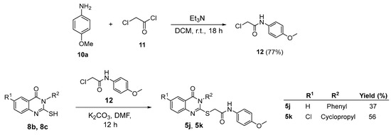 Given that not all quinazolinone-based amides were able to be successfully synthesised by reacting carboxylic acid 9 with a substituted amine and HATU, an alternate strategy was proposed: this involved reacting 2-chloroacetamide 12 with 8b and 8c to form the corresponding quinazolinone-based amides. 4-Methoxyaniline 10a was first converted to 2-chloroacetamide 12 by nucleophilic addition with chloroacetyl chloride 11 at room temperature for 18 h. 2-Chloroacetamide 12 was then reacted with 8b and 8c in DMF at 50 °C to produce their corresponding quinazolinone-based amides 5j and 5k in 37% and 56% yield, respectively (Scheme 3).
