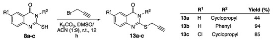 To a solution of the appropriate thiol compound 8 (1.0 equivalent) in dimethyl sulfoxide (DMSO)/acetonitrile (ACN) (1:9), propargyl bromide (1.2 equivalent) and potassium carbonate (3.0 equivalent) was added. The reaction mixture was stirred at room temperature for 8 h. After completion, water was added to the reaction mixture and the product was extracted with EtOAc (3 × 15 mL). The combined organic extracts were washed with brine, dried over anhydrous magnesium sulfate and concentrated in vacuo to afford the final solid product 13.