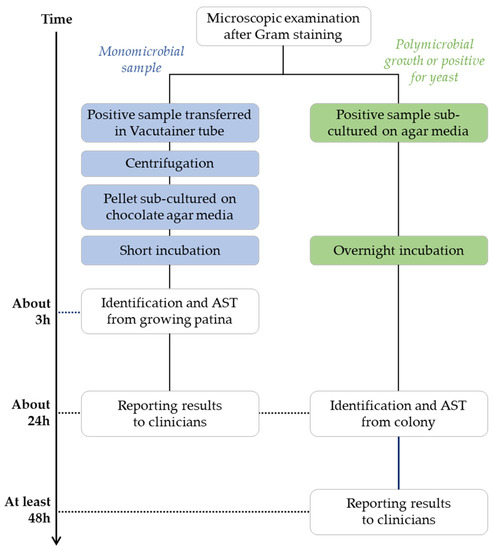 Blood culture diagnostics following conventional culture methods. Blood culture bottles (BacT/Alert Plus aerobic/anaerobic/pediatric samples, bioMérieux, Marcy l’Etoile, France) were incubated in BacT/AlertVirtuo® instrument (bioMérieux, Marcy l’Etoile, France) at 37 °C. Bottles flagged positive were removed and a Gram stain was performed. From all positive blood cultures, one drop was straked onto different agar plates, including Columbia agar with 5% sheep blood, Chocolate agar with polyvitex, Columbia ANC agar with 5% sheep blood, MacConkey agar, Schaedler agar with Vitamin K1 and 5% sheep blood, and Sabouraud agar with gentamicin and chloramphenicol. Incubation was carried out at 36 °C for a maximum of 48 h in O2, 5% CO2, or anaerobic atmosphere to enable bacterial growth. If a monomicrobial bacterial population was detected by microscopic examination, an aliquot (2.5 mL) of each sample was transferred in a tube with a gel separator (BD Vacutainer® Blood Collection Tubes, Becton Dickinson and Company, Franklin Lakes, USA) and centrifuged at 3500 rpm for 10 min. The supernatant was discarded and the pellet was inoculated on Chocolate agar with polyvitex plate and incubated at 36 °C in 5% CO2 for 3 h. Microbial identification was obtained by MALDI-TOF MS (Vitek MS, bioMérieux) after 3 h or overnight growth. All colonies with different morphotypes were identified on plates after overnight incubation. Susceptibility tests were performed according to the identified microorganism: VITEK 2 instrument (bioMérieux) for non-fastidious bacteria, Kirby-Bauer diffusion susceptibility test according to the EUCAST guidelines for fastidious microorganisms, and Sensititre YeastOne (ThemoFisher Scientific, Waltham, MA, USA) for antifungal sensibility/resistance panel. Results were interpreted according to current EUCAST criteria for bacteria and CLSI criteria for fungi. A flowchart of these conventional diagnostic methods is represented in Figure 1.
