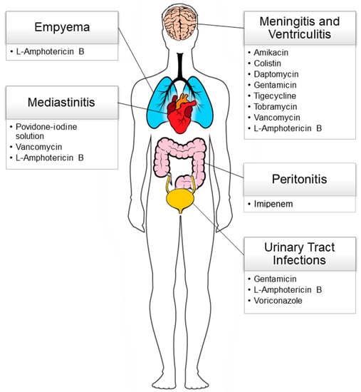 - Nau, R.; Blei, C.; Eiffert, H. Intrathecal antibacterial and antifungal therapies. Clin. Microbiol. Rev. 2020, 33, 10–1128. [Google Scholar] [CrossRef]