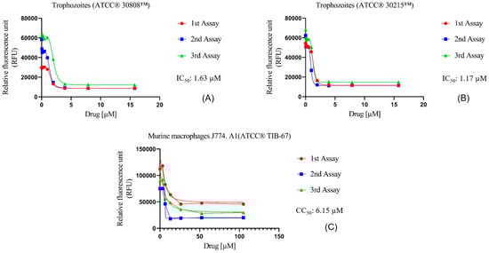 All experiments were performed in three independent assays, and the results were defined as the mean value ± standard deviation. The fluorescence data was obtained using EnSpire® Multimode Plate Reader (PerkinElmer, Madrid, Spain). Once the values were obtained, data were analyzed using GraphPad Prism 9 by performing a nonlinear regression to obtain the amoebicidal activity, which will be represented as the IC50.