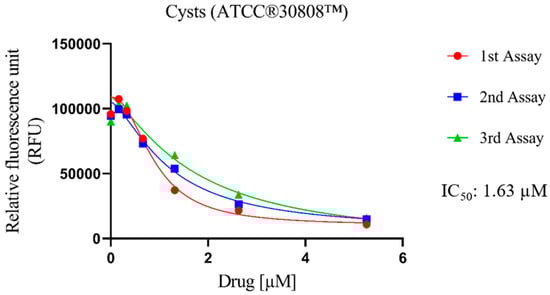 Dose–response curves of Nitroxoline against the cyst stage of N. fowleri (ATCC® 30808™). This effect was measured by adding Nitroxoline for 24 h; then the drug was removed and replaced with fresh Bactocasitone medium for 72 h at 37 °C. The cysticidal activity experiment was performed using three independent assays, as illustrated in the graphical legends.