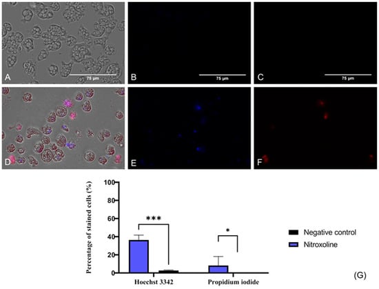 To evaluate if Nitroxoline induces chromatin condensation, the Hoechst 33342 stain (Life Technologies, Madrid, Spain) was used. This dye binds to the condensed chromatin and emits blue fluorescence at 461 nm. Furthermore, the propidium iodide (PI) (Life Technologies, Madrid, Spain) was also employed in this assay. The PI is able to cross the membrane of dead cells and bind to the nucleus, emitting a red fluorescence at 535/617 nm. In Figure 3, the blue fluorescence that corresponds to the condensed chromatin of treated cells (Figure 3D,E) is illustrated, whereas no fluorescence is emitted by the negative control (untreated) cells (Figure 3A,B). Regarding the red fluorescence of the PI, it is not visible in healthy trophozoites (Figure 3C), whereas Nitroxoline-treated amoebae show the red fluorescence of the PI-bound DNA (Figure 3F). These results suggest that the observed amoebae are undergoing a late apoptotic phase. The two-tailed t-test determined that the differences in the percentage of stained cells between the negative control and the treated cells are statistically significant in both experiments; *** p < 0.001 (Hoechst 33342), * p < 0.1.