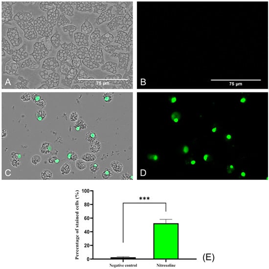 Plasma membrane permeability assay with the SYTOX™ Green dye. Nitroxoline IC90-treated trophozoites during 24 h (C,D) show an intense green fluorescence after the binding of the stain to the DNA. On the other hand, untreated amoebae (A,B) show no fluorescence since the dye is not capable of entering to the cytoplasm and hence cannot bind to the nucleic acids. Images (×40) were taken with the EVOS™ M5000 Imaging System (Invitrogen by Thermo Fisher Scientific, Spain) and are representative of the cell population. Scale bar: 75 μm. (E) The graph shows the percentage of stained cells of treated and negative control cells, represented as mean value ± SD. Three independent assays were conducted with the EVOS M5000 software tools. Five different images were processed each time. The differences between the values of both groups of amoebae were determined using a two-tailed t-test; *** p < 0.001.