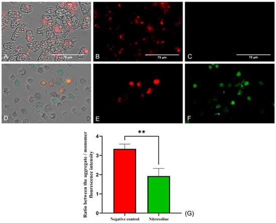 JC-1 Mitochondrial Membrane Potential Detection Kit assay. Cells incubated with the IC90 of Nitroxoline for 24 h (D–F). Untreated cells (A–C). In healthy conditions, the stain remains in the mitochondria forming J-aggregates and emits a red fluorescence at 590 nm (B). When the mitochondrial membrane potential is decreased, the dye is presented in monomers and emits a green fluorescence at 529 nm (F), while the red fluorescence is reduced (E). No green fluorescence can be seen in the negative control (C). Images (×40) are representative of the cell population in well and were taken in the EVOS™ M5000 Imaging System (Invitrogen by Thermo Fisher Scientific, Spain). Scale bar: 75 µm. (G) The graph shows the ratio between the fluorescence emitted by the aggregate and the monomer forms of the JC-1 after the incubation with the treated and negative control cells. Data are presented as mean ± SD after three independent assays. The fluorescence was evaluated using the EVOS M5000 software tools, and five images were analyzed each time. The statistical difference between the ratios of both group of cells was determined by a two-tailed t-test; ** p < 0.01.