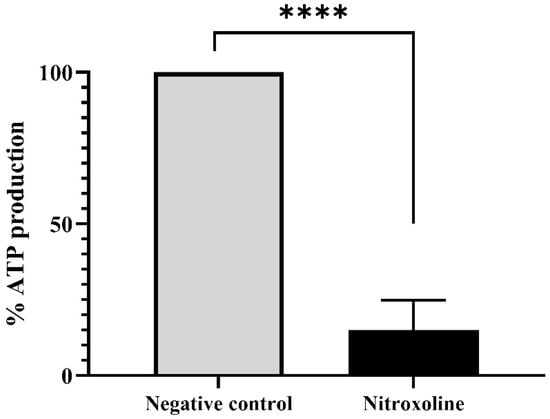 Furthermore, the ATP levels were evaluated with the Cell Titer-Glo® Luminescent Cell Viability Assay kit (Promega Biotech Ibérica, Madrid, Spain). Results are presented in Figure 6, where it is shown that the treatment of the trophozoites with the IC90 of Nitroxoline reduces the ATP production at 85% compared to the untreated cells (negative control). Moreover, the performed two-tailed t-test determines that this decrease is statistically significant (** p < 0.01), confirming the mitochondrial damage.