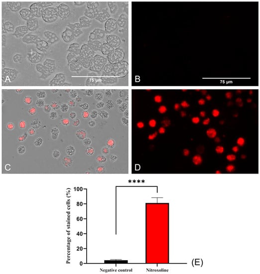 To evaluate the oxidative stress in the amoebae (treated and non-treated), a fluorogenic probe, namely, CellRox, was used. This reagent, in the presence of diverse molecules, such as free radicals or peroxides, emits red fluorescence. For this reason, in viable amoebae (Figure 7A,B), where no oxidizing species were accumulated, no fluorescence was observed. In contrast, in Nitroxoline-treated amoebae, red fluorescence was observed due to the interaction of excessive ROS and the reagent (Figure 7C,D). Differences between the values were assessed using a two-tailed t-test. The results display significant differences (**** p < 0.0001) when comparing treated cells to the negative controls.