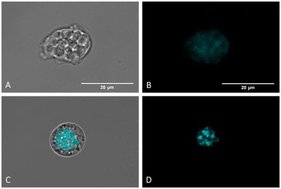 Autophagic processes were detected using MDC labelling (a fluorescent probe that accumulates in autophagic vacuoles [35,36] and analyzed via fluorescence microscopy. Figure 6C,D show that Monodansylcadaverine (MDC) stains autophagic compartments (brightest zones), which are indicative of a self-degradation pathway. Moreover, negative control amoebae (Figure 8A,B) display no fluorescence, indicating the absence of autophagic compartments.