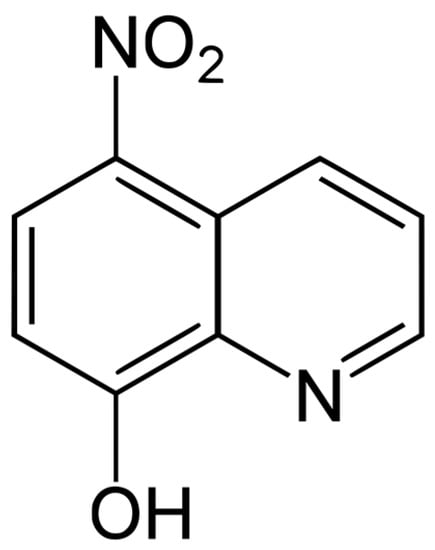 Nitroxoline compound (Figure 9) was provided free of charge by Rosen Pharma St. Ingbert Germany. The stock solution was dissolved in dimethyl sulfoxide (Sigma Aldrich, Darmstadt, Germany) at a concentration of 40 mg/mL and preserved at −20 °C until required. Dilutions were prepared in Bactocasitone medium 2% (v/w).