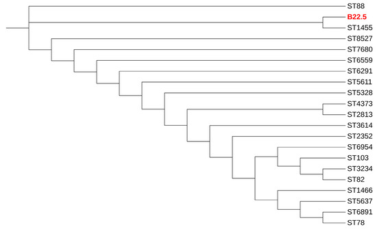 The construction of the phylogenetic tree for STs that are closely related to strain B22.5, a new ST, was performed in this study via Phylogeny.fr [72]. The phylogenetic tree was visualized using the Interactive Tree of Life (iTOL) (http://itol.embl.de, (accessed on 7 July 2023) [73].
