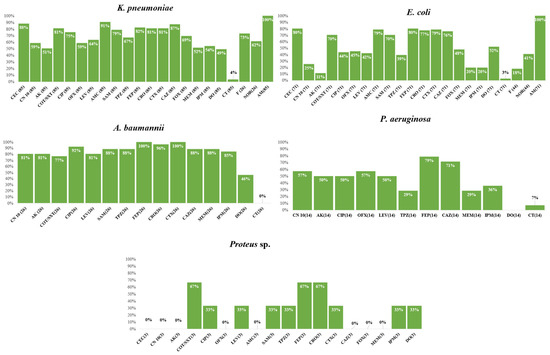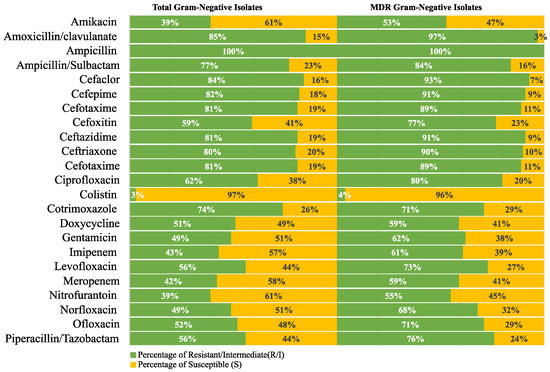 Resistance frequency of the tested antimicrobial agents in all MDR Gram-negative isolates.
