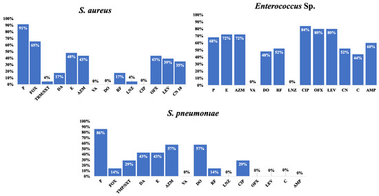 Frequency of antimicrobial resistance of various Gram-positive species to the tested antimicrobial agents. Cefoxitin is used as a surrogate for oxacillin disk-diffusion test; Susceptibility to vancomycin was tested using MIC determined by an E-test; Gentamicin 120 µg disk was used for testing HLAR is Enterococci; Oxacillin is used as surrogate for β-lactams disk-diffusion tests; Abbreviations: AMP, ampicillin; AZM, azithromycin; C, chloramphenicol; CIP, ciprofloxacin; CN, gentamicin; TMP/SXT, trimethoprim–sulfamethoxazole; DA, clindamycin; DO, doxycycline; E, erythromycin; FOX, cefoxitin; F, nitrofurantoin; LEV, levofloxacin; LNZ, linezolid; NOR, norfloxacin; OFX, ofloxacin; P, penicillin; RF, rifampin; VA, vancomycin. Percentages were calculated with reference to the total number of the tested isolates.