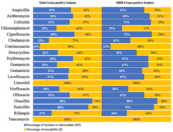 Resistance frequency of the tested antimicrobial agents in all MDR Gram-positive isolates.