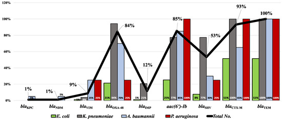 Prevalence of the screened antimicrobial resistance genes in the tested MDR clinical isolates. Bars represent the percentage of each gene in each bacterial species while the line represents the total prevalence of each gene.