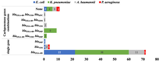 Remarkably, 15/103 (14.56%) MDR isolates co-harbored more than one CPase-coding gene. In comparison, 77/103 (74.75%) carried only a single gene (Figure 7). Out of the 103 isolates harboring CPases-encoding genes, the co-existence of blaOXA−48 and blaIMP was detected in nine isolates (8.7%) while both (blaOXA−48 and blaVIM) and (blaOXA−48, blaVIM and blaIMP) co-existed in two isolates for each. Finally, (blaOXA−48 and blaNDM) and (blaOXA−48, blaKPC and blaVIM) were recorded in one isolate (0. 97%). Testing the association between the resistance genes and the phenotypic resistance to different antimicrobial agents showed that only blaVIM had a statistically significant association with imipenem and meropenem resistance, with p-values of 0.011 and 0.026, respectively. This was only found among K. pneumoniae isolates. None of the ESBL-coding genes showed a statistically significant association with resistance to any of the tested β-lactam antibiotics. Finally, acc-(6′)-Ib showed a statistically significant association with gentamicin resistance (p-value 0.045) in A. baumannii but not with amikacin or any of the tested fluoroquinolones. The p-values calculated for all genes and antimicrobial agents are shown in Tables S2–S4.