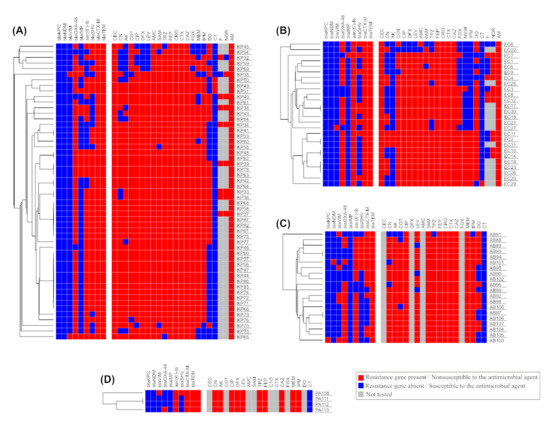 Heatmap analysis (A) for 53 isolates from K. pneumoniae, (B) for 26 isolates from E. coli, (C) for 20 isolates from A. baumannii, (D) for 4 isolates from P. aeruginosa. The figure also shows a hierarchical clustering for all isolates that belong to the same species based on the available phenotypic and genotypic data.