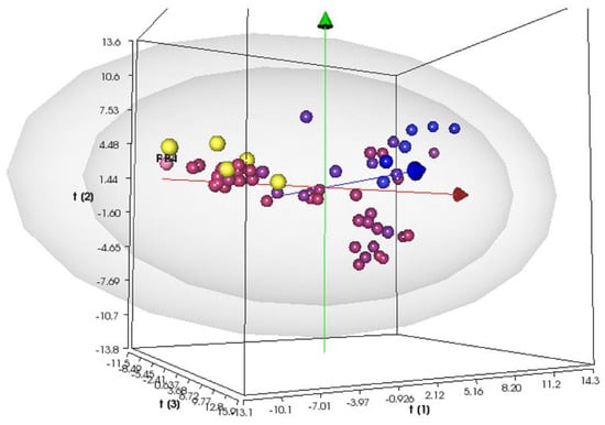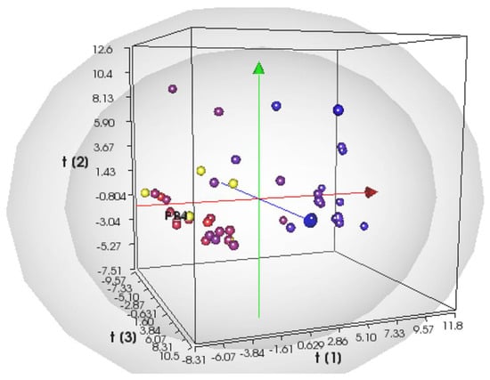 Since the model seems to clearly separate active from inactive heteroaryl ethylene compounds, we projected the six compounds previously selected into the model for cytotoxic activity prediction. Surprisingly, the results follow the patterns given in the previous PLS model: compound GC-VI-10 was located outside the 95% confidence interval of the score plot, while the remaining candidates are projected in the region of the most active antimicrobial compounds active towards the CaCo-2 colon–rectal cancer cell line.