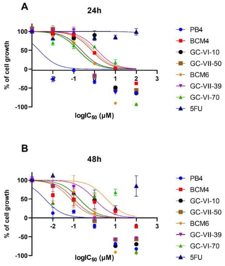 The results of the MTT assay show that all heteroaryl ethylene compounds exhibited significantly higher cytotoxicity than 5-FU [23], which served as the reference antitumor compound in the assay. Among the compounds tested, BCM6, GC-VII-39, and GC-VII-50 displayed the highest cytotoxicity at 24 h, with IC50 of 0.16, 0.23, and 0.17 μM, respectively. In comparison, 5-FU showed a 24-h IC50 of approximately 27 μM. Due to their low cytotoxicity, we assessed the combined effects of GC-VI-70 and PB4 as antimicrobial agents (see Section 2.2 and Table 3).