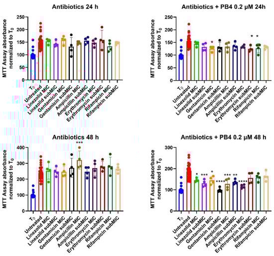 To highlight the statistical differences between the treated and untreated cells, a Dunnett’s multiple comparisons test was performed (Table S3). No remarkable statistical differences emerged for the cells treated with antibiotics alone, with the only exception being observed between the untreated cells and the cells treated with ampicillin at the MIC concentration after 48 h. When cells were treated with antibiotics and PB4, after 24 h, there was a statistical difference only with the cells treated with the gentamicin MIC concentrations, erythromycin sub-MIC concentrations, and rifampicin MIC concentrations. However, these differences were not statistically significant. Nevertheless, after 48 h, the cells treated with antibiotics and PB4 exhibited significant statistical differences compared to the untreated cells, except the rifampicin-treated cells at the MIC and sub-MIC concentrations, and the erythromycin-treated cells at the sub-MIC concentrations.