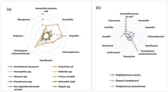 AMR typically occurs in microorganisms that cause pneumonia, diarrheal illnesses, tuberculosis (TB), sexually transmitted diseases, and malaria in Africa. These pathogens are among those that are likely to be spread within the population. Fighting TB, malaria, pediatric dysentery, and pneumonia now costs much more money due to drug resistance. Additionally, it jeopardizes efforts to successfully treat HIV/AIDS patients [10]. In a recent attempt to define the AMR burden in Africa, the WHO African region carried out a systematic review comprising isolates from 2016 to 2020. They concluded that Escherichia coli (E. coli) was the most resistant Gram-negative bacteria with more than 20% resistance observed for amoxicillin (24.5%), ampicillin (23.5%), and trimethoprim/sulfamethoxazole (22.5%). Additionally, high resistance was observed for other first- and second-line antibiotics; for example, amoxicillin/clavulanic acid (13.2%), chloramphenicol (12.3%), and ciprofloxacin (8.2%), (Figure 1) [7]. Similarly for Gram-positive bacteria, of worrying concern is the high rate of resistance of Streptococcus pneumoniae to trimethoprim/sulfamethoxazole (64.3%) which is a commonly used antibiotic. Other commonly used antibiotics with a high percentage of resistance include oxacillin (32.2%), tetracycline (28.3%), penicillin (23.2%), amoxicillin (20.6%), and ampicillin (19.3%) (Figure 1) [7].