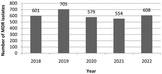 Over the 2018–2022 period, when only the first occurrence of isolation for a given bacterium/patient couple is taken into account, the overall number of isolated MDR bacteria was 2842 (Table S1). The number of MDR per year is displayed in Figure 1.The observed distribution of MDR isolates was not statistically different from an expected homogenous distribution over the five years (p = 0.975, Kolgromov–Smirnov test). The highest number of MDR isolation was obtained in 2019 and the lowest in 2021 with 23.1% and 18.2% of the overall number of harvested MDR isolates, respectively.