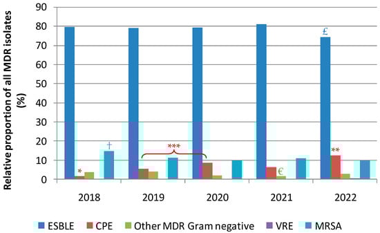 Yearly distribution of the main MDR categories. MRSA: Methicillin-resistant Staphylococcus aureus; VRE: Vancomycin-resistant enterococci; CPE: Carbapenem-producing enterobacteria; ESBLE: Extended-spectrum beta-lactamase-producing enterobacteria. £: relative proportion for ESBLE significantly lower than those in all other years at p < 0.05 (Pearson’s Chi-square test); †: relative proportion for MRSA significantly higher than those in years 2020, 2021, and 2022 at p < 0.05 (Pearson’s Chi-square test); *: relative proportion for CPE significantly lower than those in all other years at p ≤ 0.0005 (Pearson’s Chi-square test); **: relative proportion for CPE significantly higher than those in years 2019, 2020 and 2021 at p ≤ 0.04 (Pearson’s Chi-square test); ***: significant difference at p = 0.0293 (Pearson’s Chi-square test); €: relative proportion for other MDR Gram-negative bacteria significantly lower than those in years 2018 and 2019 at p ≤ 0.04 (Pearson’s Chi-square test).