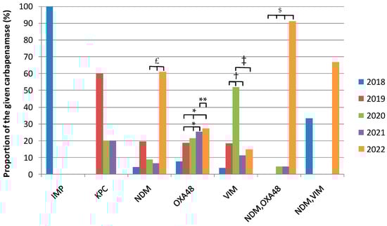 As can be seen in Figure 3, a steady increase in the proportion of OXA48-carrying strains was found over the 5-year period with a significantly higher value in 2022 as compared to all other years, with the exception of 2018. Moreover, peaks in VIM- and NDM/OXA48-producing isolates were observed in 2020 and 2022, respectively. As very few isolates produced KPC, IMP, and the NDM/VIM combination, no significant differences could be witnessed over the 5 years.