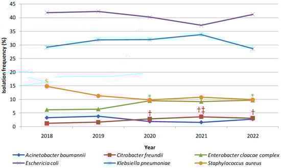 Isolation frequencies (expressed as percentages of the overall number of isolated MDR bacteria for a given year) of the main MDR species isolated. Relative proportion significantly higher at (Pearson’s Chi-square test): $ p < 0.05 for MRSA compared to those in years 2020, 2021, and 2022; * p < 0.05 for E. cloacae complex compared to those in years 2018 and 2019; † p < 0.05 for C. freundii compared to that of 2018; ‡ p < 0.02 for C. freundii compared to that of 2019.