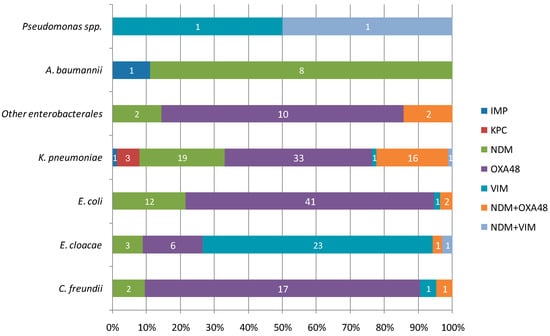 Distribution of carbapenemases in the various Gram-negative species. Numbers in white represent the number of isolates carrying the mentioned carbapenemase.